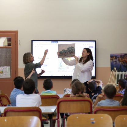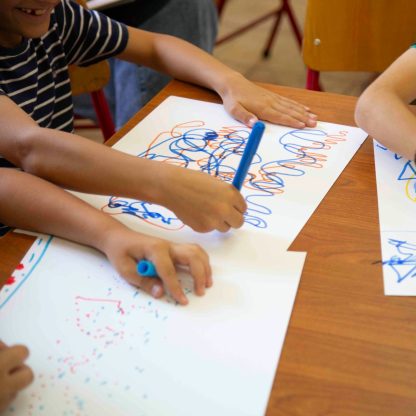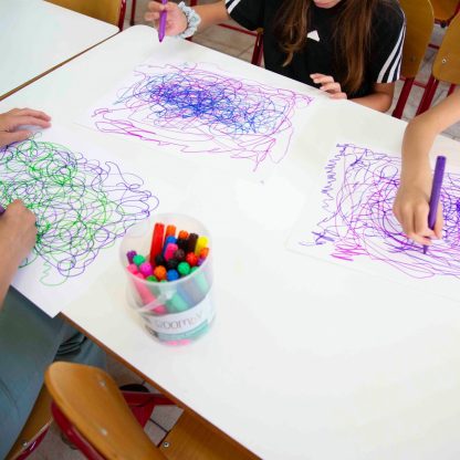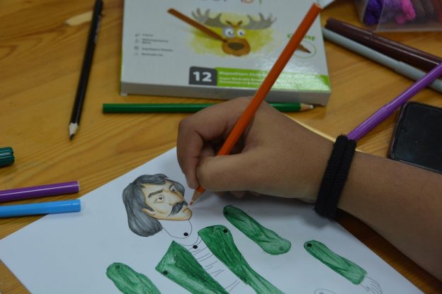 Στο 14ο Δημοτικό Σχολείο Κέρκυρας συζητήσαμε διεξοδικά με τους δασκάλους και τη διευθύντρια του σχολείου, ξεναγηθήκαμε στους χώρους, ανταλλάξαμε ιδέες για το πώς μπορούν να ενταχθούν πιο ενεργά οι εικαστικές τέχνες στη διδακτέα ύλη και συζητήσαμε με μαθητές και μαθήτριες της 6ης Δημοτικού. Τέλος, στον χώρο εκδηλώσεων του σχολείου, μαζί με 18 παιδιά της 3ης Δημοτικού υλοποιήσαμε τη δράση μας που σχετιζόταν με τη συναισθησία: πώς δηλαδή παντρεύονται οι εικαστικές τέχνες με τη μουσική. Καθώς η Κέρκυρα φημίζεται για την μουσική της παράδοση, με όχημα τη μουσική και το χρώμα αφήσαμε τα παιδιά να δημιουργήσουν αυτό που αισθάνονται ακούγοντας συγκεκριμένα μουσικά όργανα και μελωδίες.