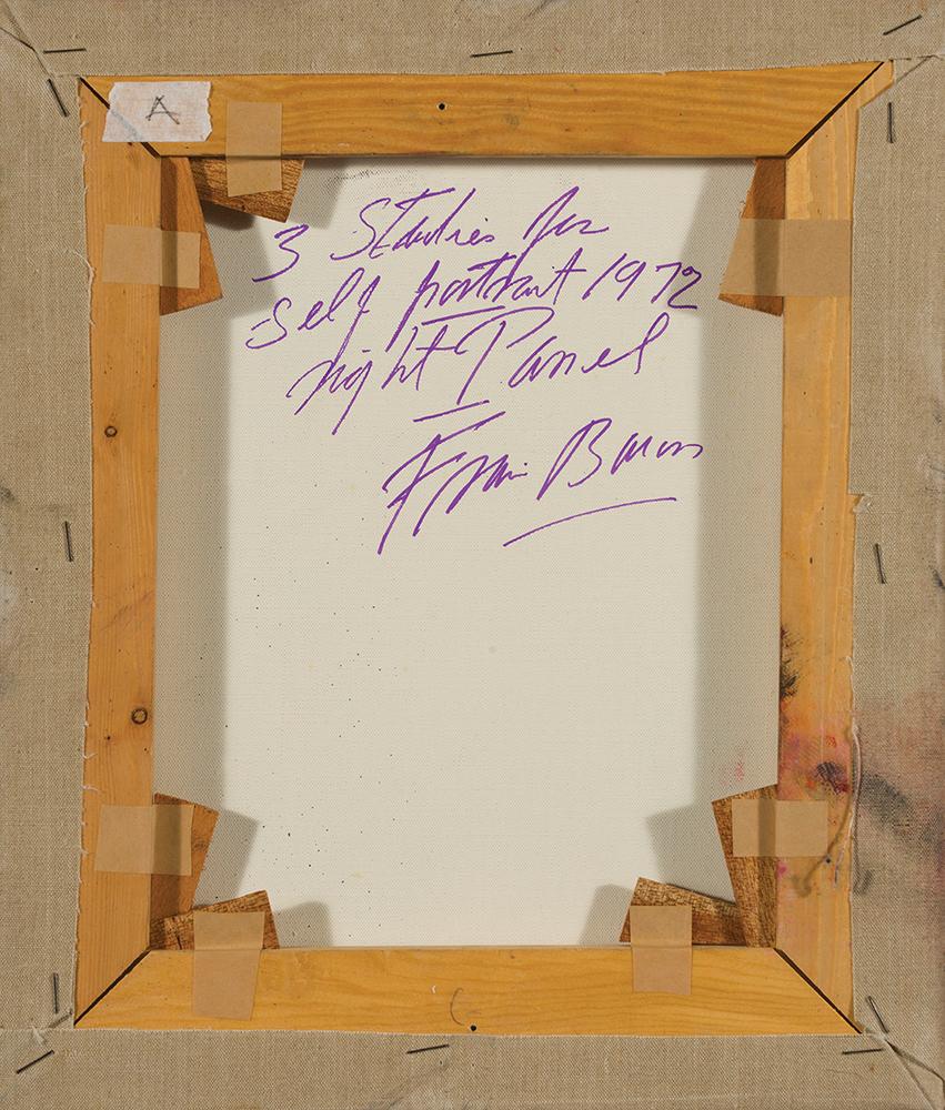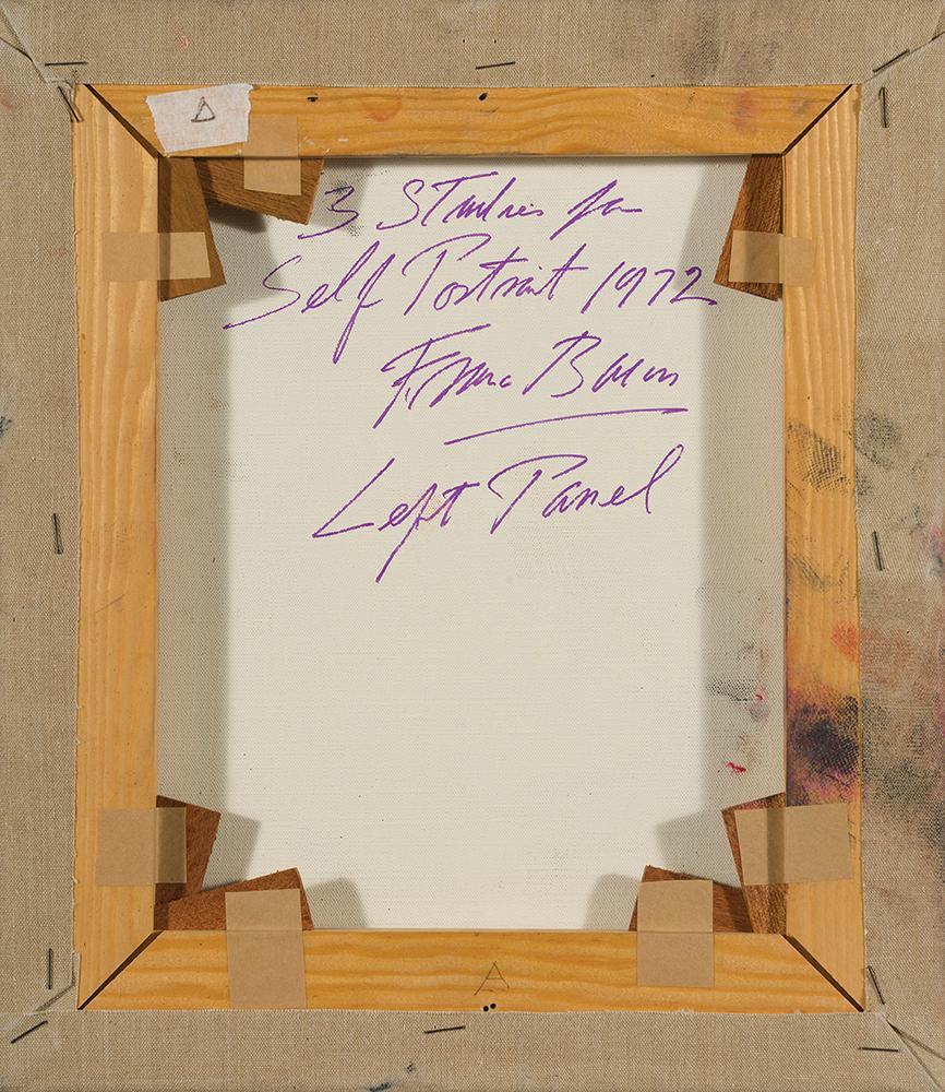 Ο Bacon στέκει με κεφάλι ίσιο και μάτια κλειστά μπροστά σε μαύρο φόντο. Φοράει γαλάζιο πουκάμισο που, σαν ήλιος, στέλνει ομοιόχρωμες ανταύγειες στα μάγουλα, στα μάτια και στη μύτη. Κατευθύνοντας το βλέμμα από τα αριστερά προς τα δεξιά, παρατηρούμε ότι το πρόσωπο σβήνει προοδευτικά, σαν να το καταπίνει το μηδέν που το περιβάλλει. Στον τελευταίο πίνακα, το μάτι και το ζυγωματικό του προσώπου δεν φαίνονται πια. Το στόμα υφίσταται επίσης συντριπτική παραμόρφωση. Παραδίδοντάς μας χωρίς συστολή τα ελαττώματα της φυσιογνωμίας του, ο ζωγράφος βάζει στο κέντρο και των τριών συνθέσεων τα μάτια. Τα βλέφαρα, μεγαλύτερα απ’ ό,τι στην πραγματικότητα, μένουν πεισματικά σφαλιστά, αρνούμενα να φανερώσουν τα μυστικά τους. Τούτη η στάση μόνο ως πρόκληση δεν πρέπει να ερμηνευθεί. Πρόκειται μάλλον για έκφραση αιδούς, σεμνότητας και προπαντός θλίψης. Και ο θεατής δεν μπορεί παρά να αισθανθεί σεβασμό γι’ αυτή την τριπλή μορφή, λεία μιας προφανούς οδύνης που προτιμά να κρατά για τον εαυτό της.