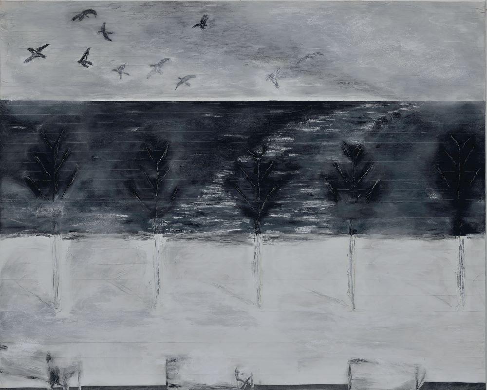 Το έργο του Νάκη Παναγιωτίδη Η καταιγίδα και το άσμα των πουλιών, που παρουσιάζεται στο πλαίσιο της αναδρομικής έκθεσης “Shut your Eyes and See” που διοργανώνει το Ίδρυμα Β&Ε Γουλανδρή, αποτυπώνει την ομορφιά και την ελπίδα της φύσης, ακόμα και μέσα στη βροχή και το σκοτάδι.