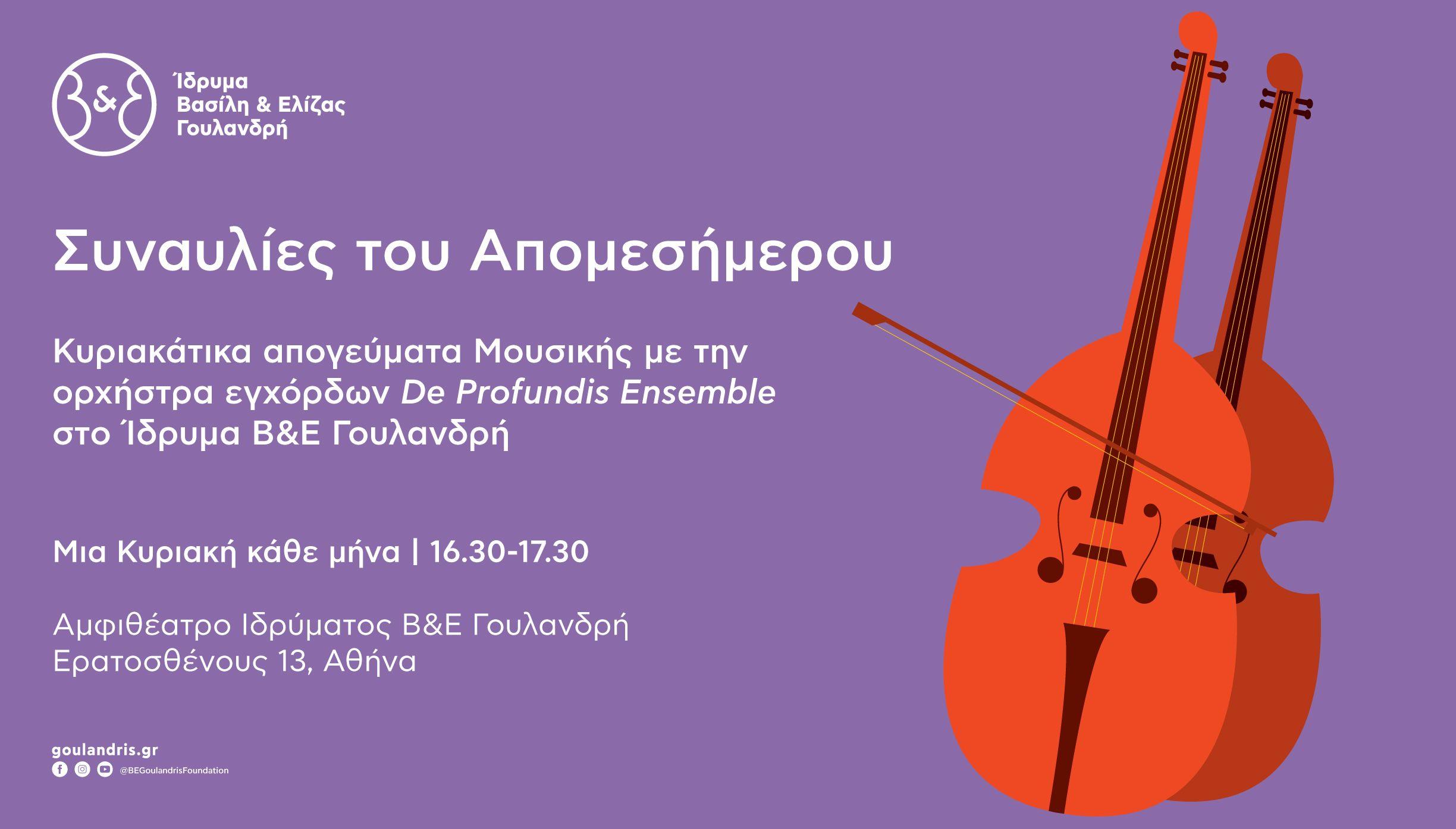 Τα απογεύματα της Κυριακής ντύνονται με μουσική στο Αμφιθέατρο του Ιδρύματος Β&Ε Γουλανδρή, στη νέα σειρά αφηγηματικών συναυλιών που φέρνουν τον κόσμο των μεγάλων συνθετών στο Μουσείο, σε συνεργασία με την ορχήστρα εγχόρδων De Profundis Ensemble.
