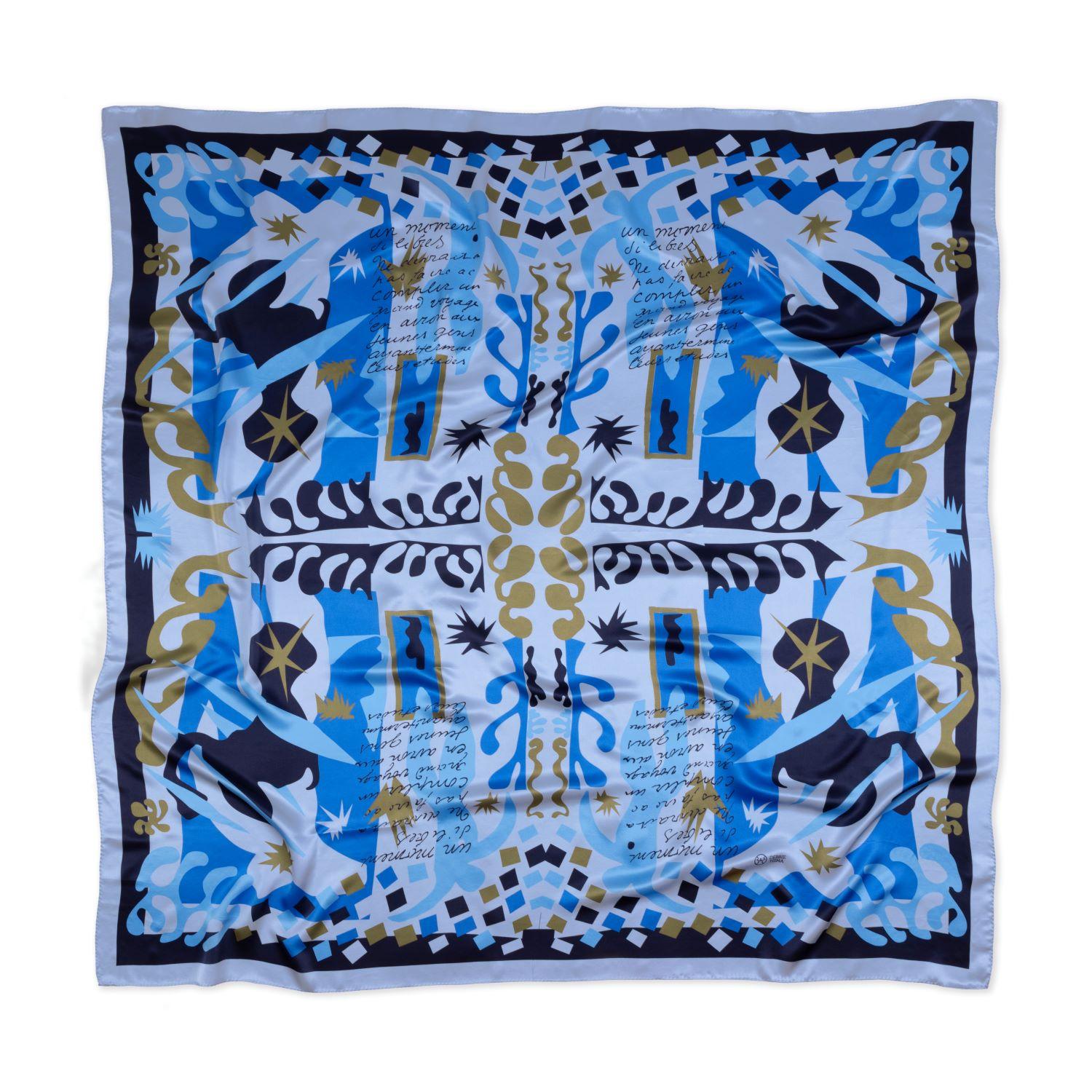 Μαντήλι από 100% ελληνικό μετάξι Σουφλίου, με σχέδιο εμπνευσμένο από έργα του Henri Matisse που περιλαμβάνονται στο λεύκωμα «Jazz», 1947. Σχεδιάζεται από την Debbie Tzima αποκλειστικά για το Ίδρυμα Βασίλη & Ελίζας Γουλανδρή.