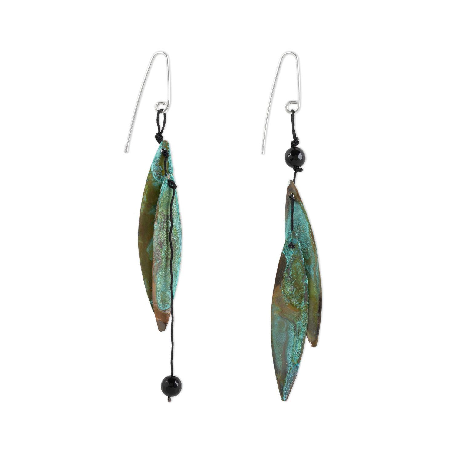 Σκουλαρίκια με φύλλα από οξειδωμένο πράσινο χαλκό, κομμένα στο χέρι, και καρπούς ελιάς από όνυχα.