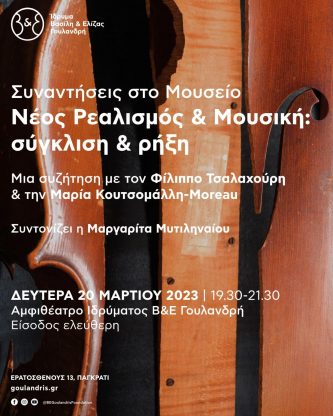 On MONDAY, MARCH 20, the curator of the "Nouveau réalisme" exhibition Marie Koutsomallis-Moreau together with composer and Director of the Athens Conservatoire Music Schools Philippos Tsalachouris will analyse the similarities as well as the possible disagreements between the new realism movement and music.